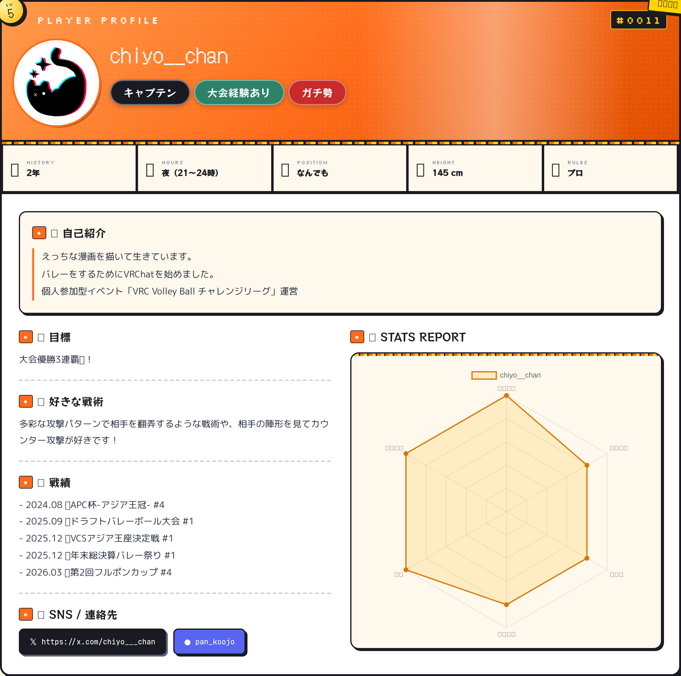 - 2024․08 🏆APC杯-アジア王冠- #4 - 2025․09 🏆ドラフトバレーボール大会 #1 - 2025․12 🏆VCSアジア王座決定戦 #1 - 2025․12 🏆年末総決算バレー祭り #1 - 2026.03 🏆第2回フルポンカップ #4