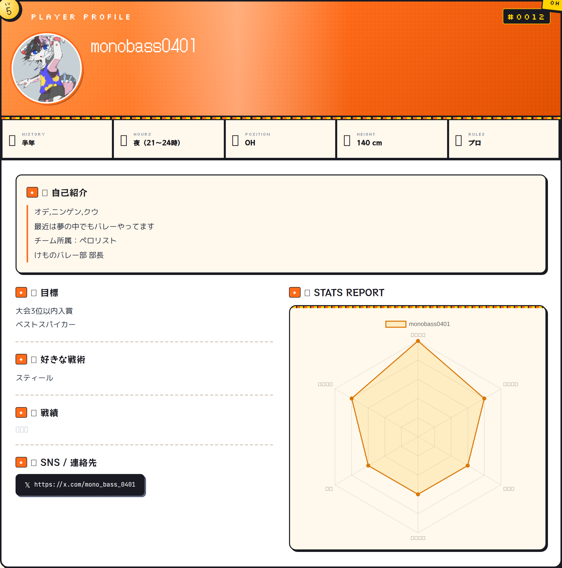 オデ,ニンゲン,クウ 最近は夢の中でもバレーやってます チーム所属:ペロリスト けものバレー部 部長