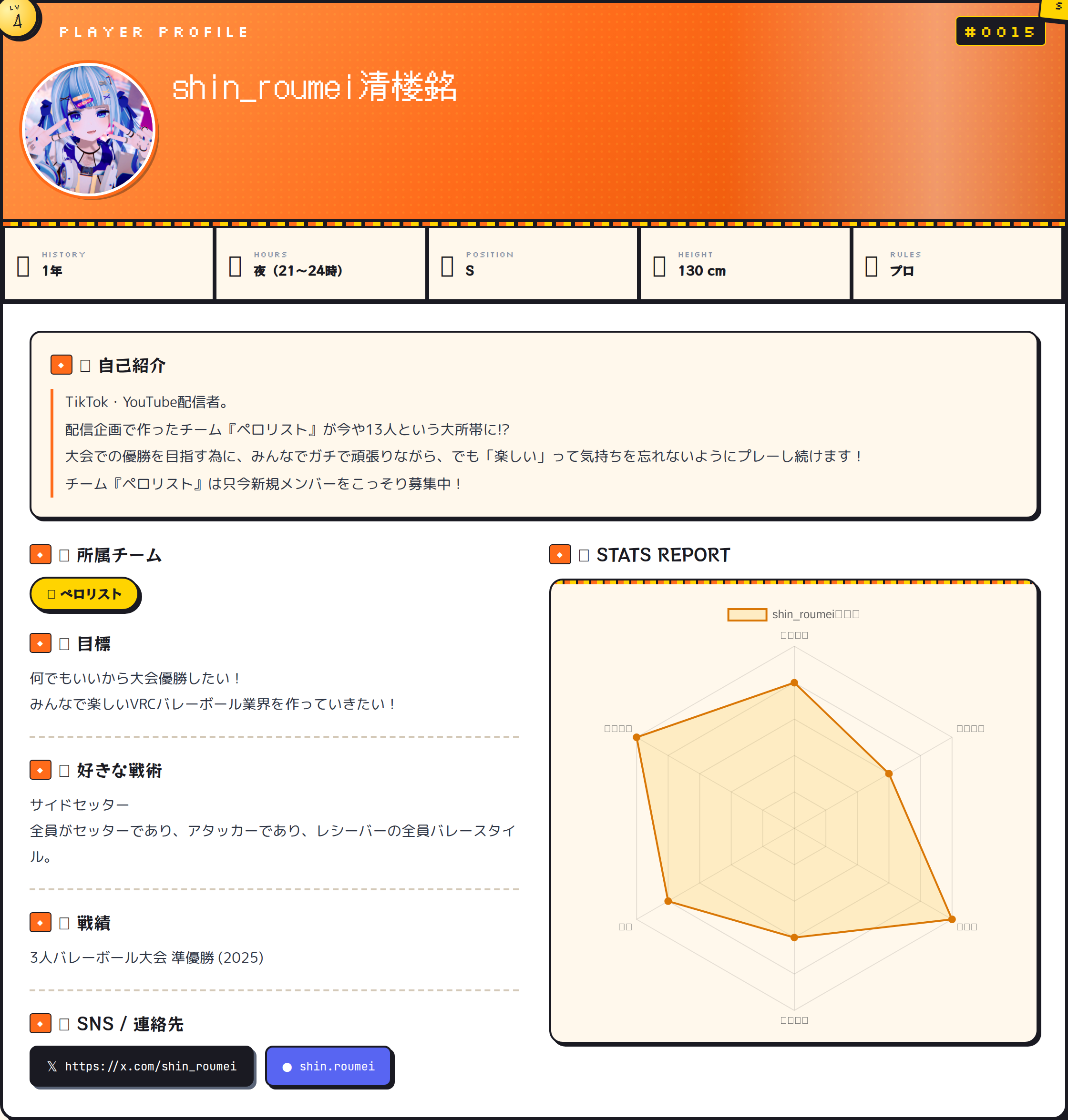 TikTok・YouTube配信者。 配信企画で作ったチーム『ペロリスト』が今や13人という大所帯に!? 大会での優勝を目指す為に、みんなでガチで頑張りながら、でも「楽しい」って気持ちを忘れないようにプレーし続けます! チーム『ペロリスト』は只今新規メンバーをこっそり募集中!
